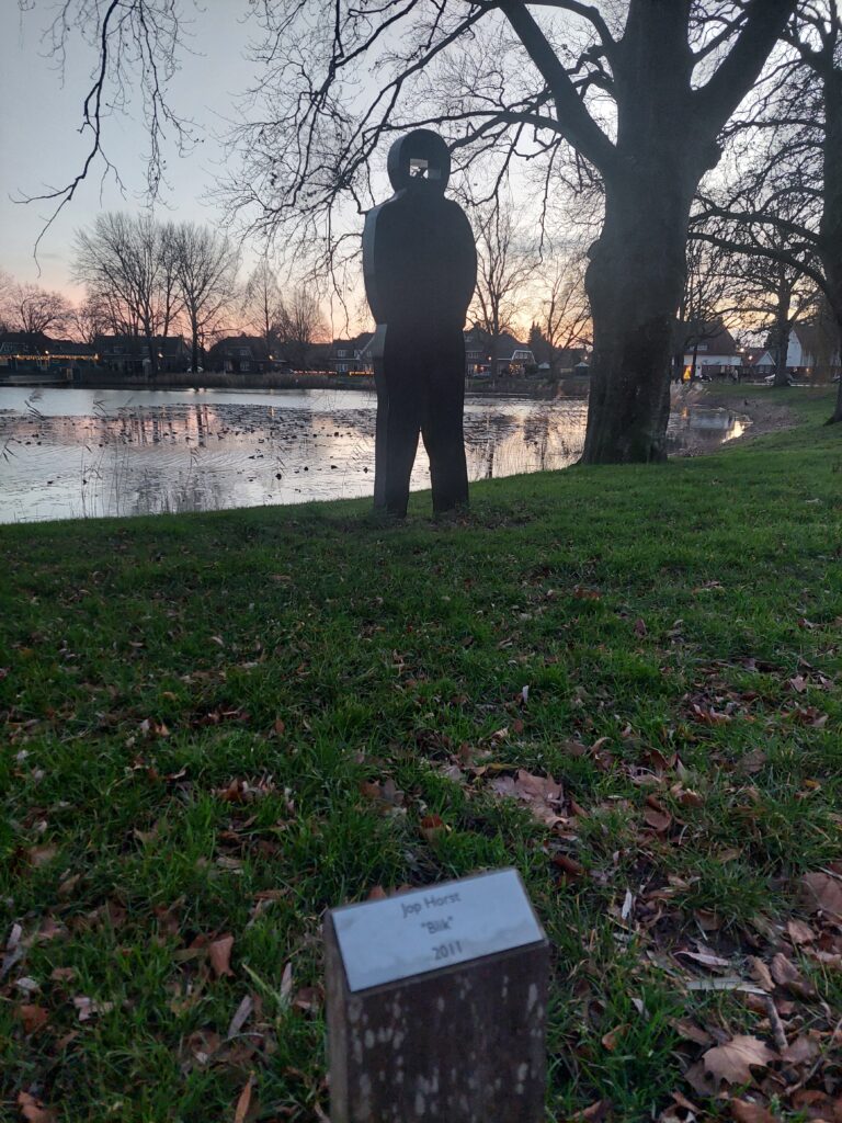 'Een staande en zwarte figuur, gemaakt naar Jop Horst's zijn eigen beeltenis. Met een doorkijkvenster op de plek van zijn ogen. Hij staat tussen de bomen met de 'blik' gericht naar het water.